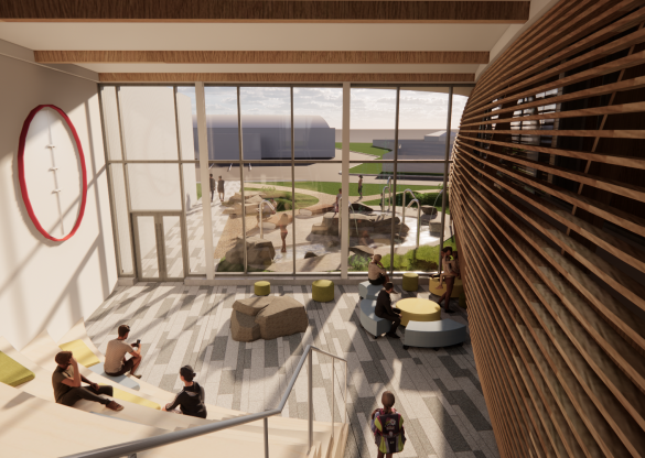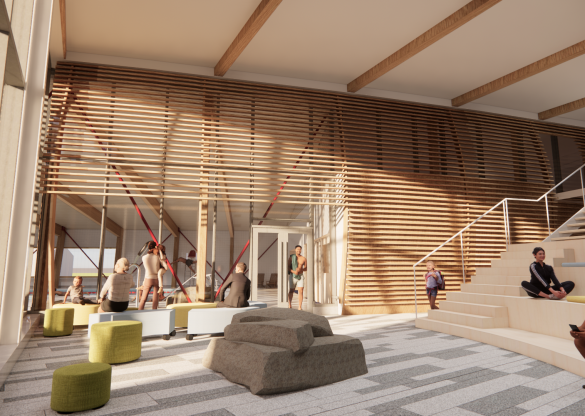 Through the consultation process, the design for the sports centre was inspired by two sacred indigenous symbols, the canoe and the sacred drum (Tewegan). The structure of the pool addition is inspired by the canoe hull. The hull structure is used throughout the whole building and acts as a sunshade at the entrance of the building.