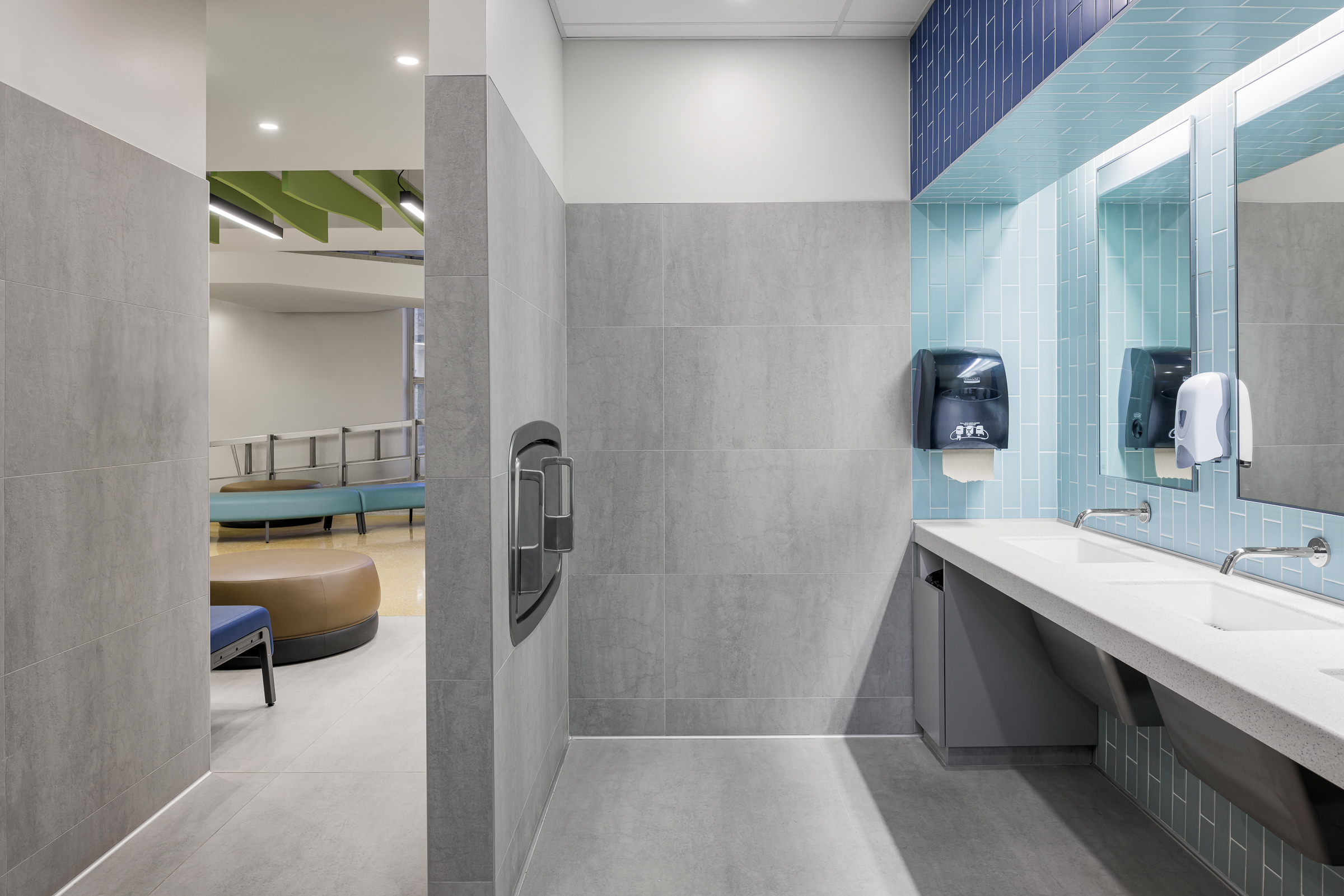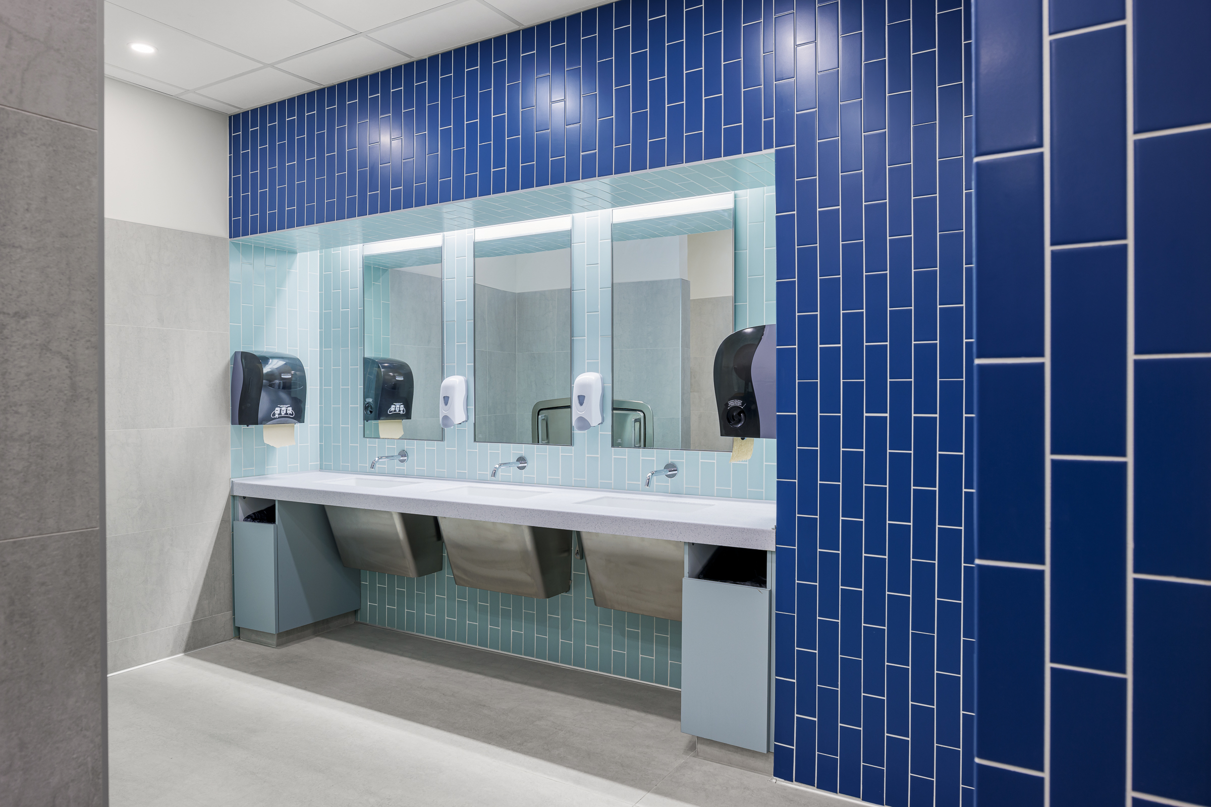 Le son voyage aisément non seulement entre les cabines de toilettes mais aussi des cabines vers le couloir public. Pour répondre à cette problématique, Figurr a opté pour des cabines individuelles fermées avec des murs isolés de pleine hauteur, au lieu des partitions de toilettes classiques. Ce choix de conception offre un bien meilleur contrôle acoustique.