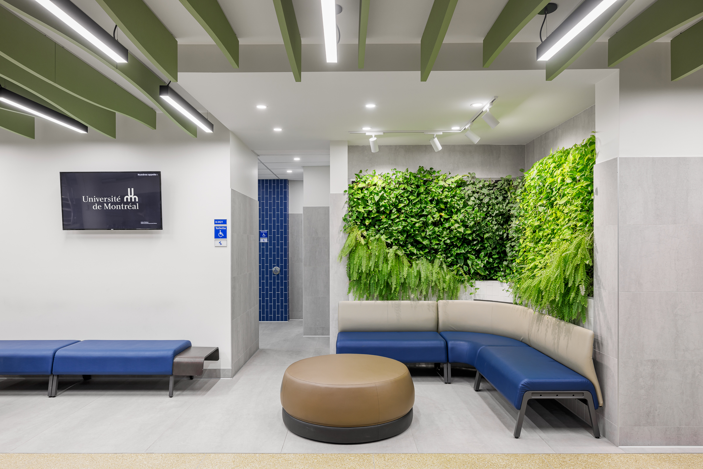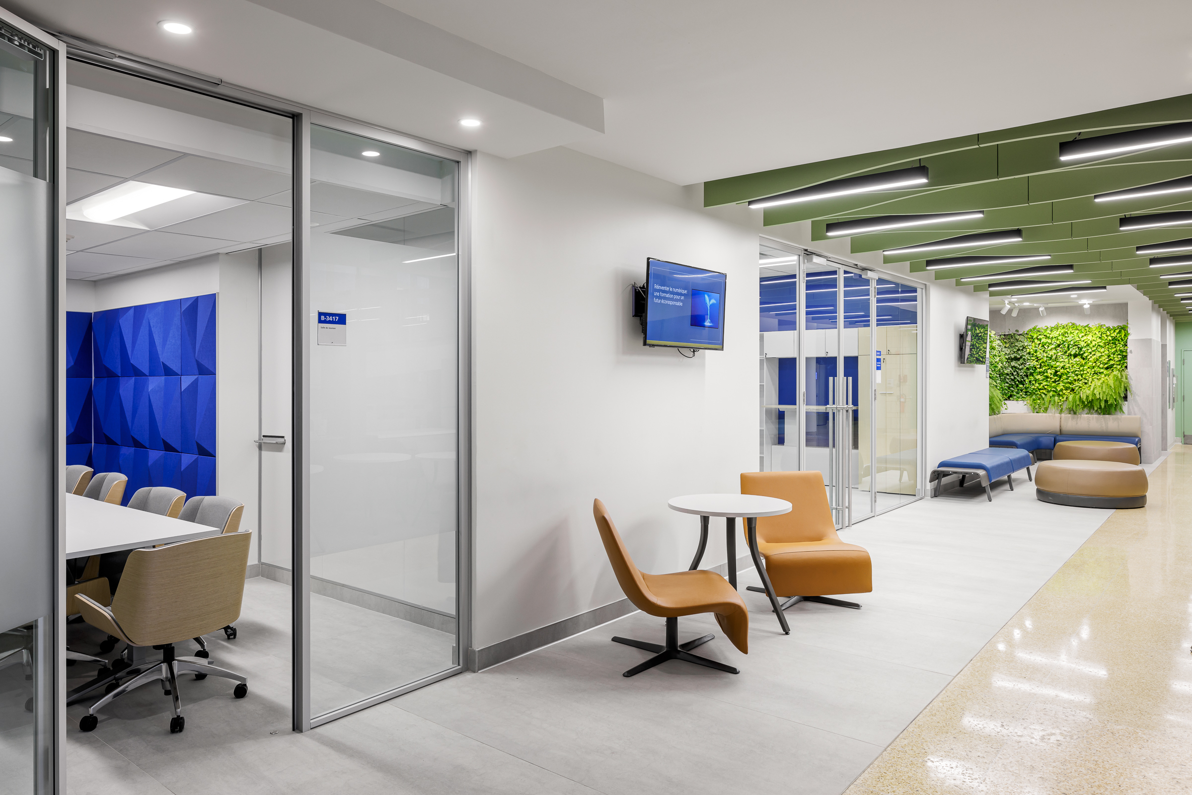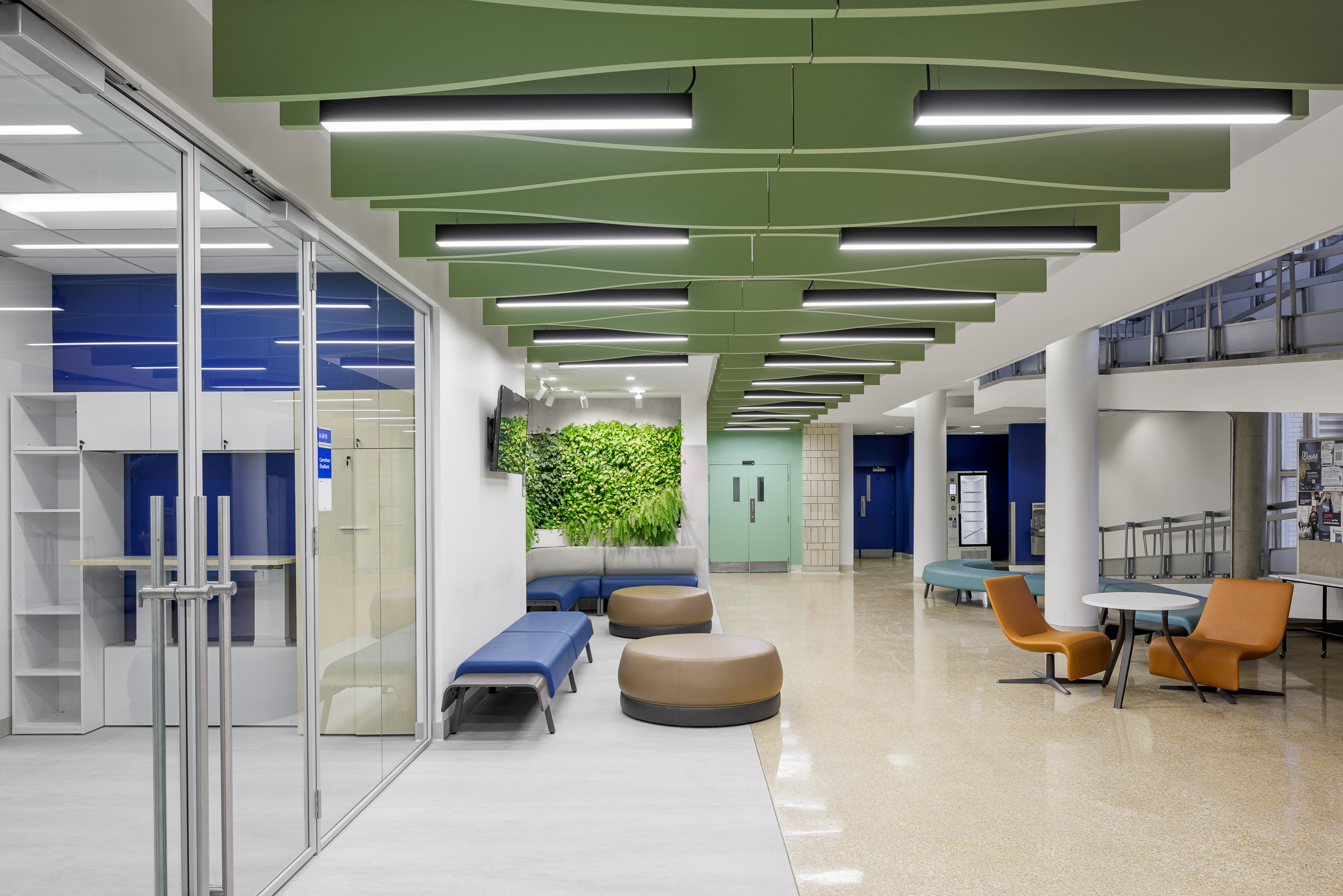 L’aire d’attente comprend des murs biophiliques, favorisant le bien-être des étudiant.e.s tout en améliorant le contrôle du bruit. Cet espace sert non seulement d'aire d’attente, mais aussi de point de rencontre et de circulation générale.
