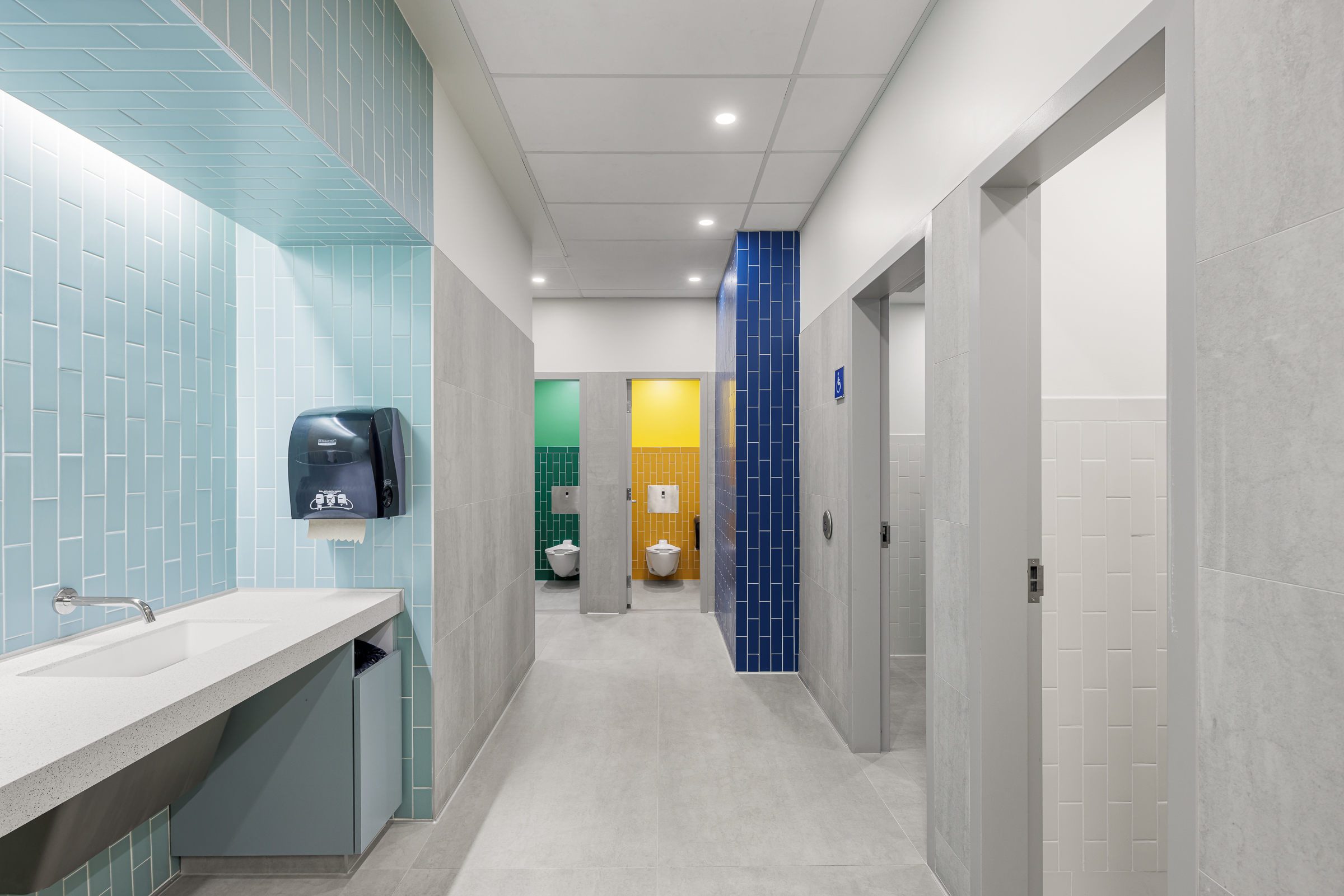 L’un des grands principes de conception du projet consistait à utiliser l’espace de circulation des blocs sanitaires comme la continuité du couloir public, réduisant ainsi la zone dédiée aux toilettes.