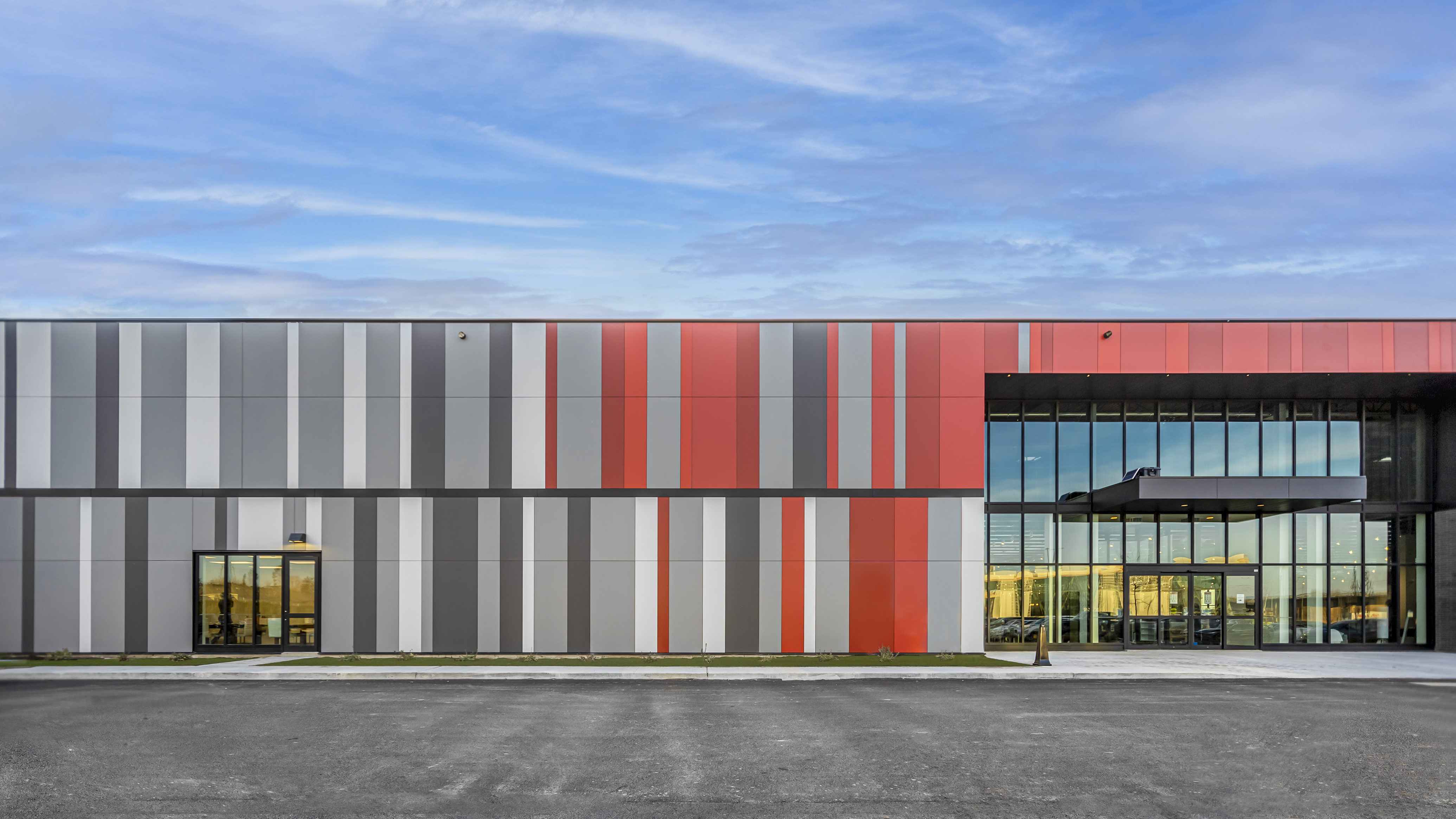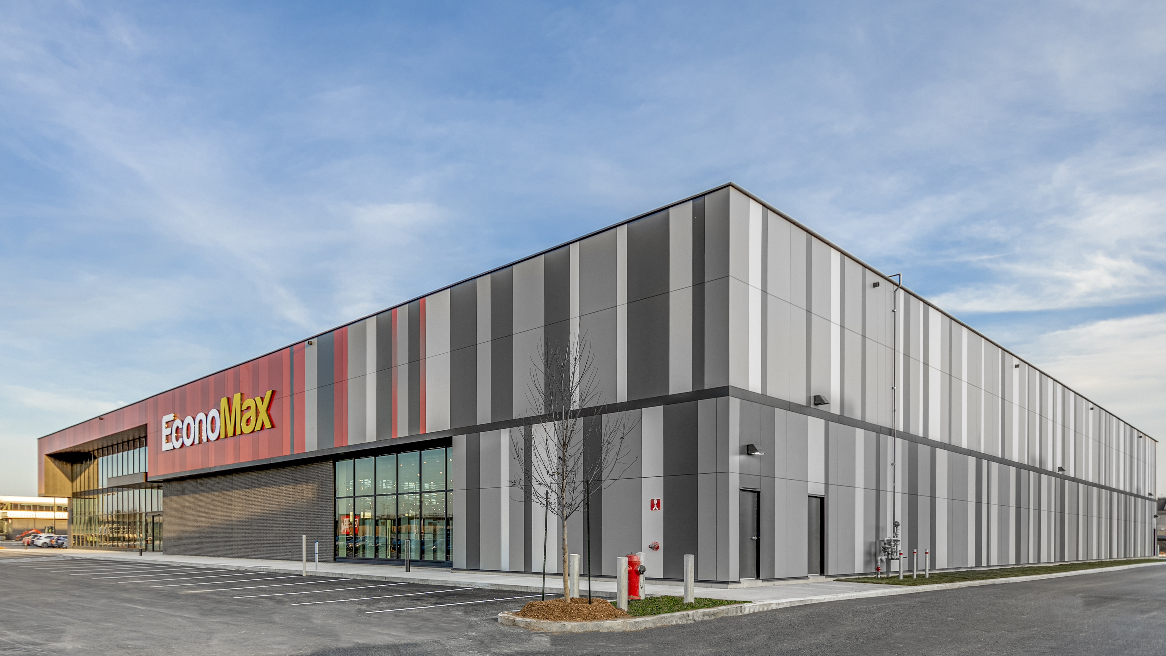 Bâti aux abords de l’autoroute Transcanadienne, le magasin EconoMax se devait d’être facilement repérable par les consommateurs et automobilistes tout en offrant un intérêt architectural. Le bâtiment offre une simplicité de forme qui rejoint la simplicité de la marque.
