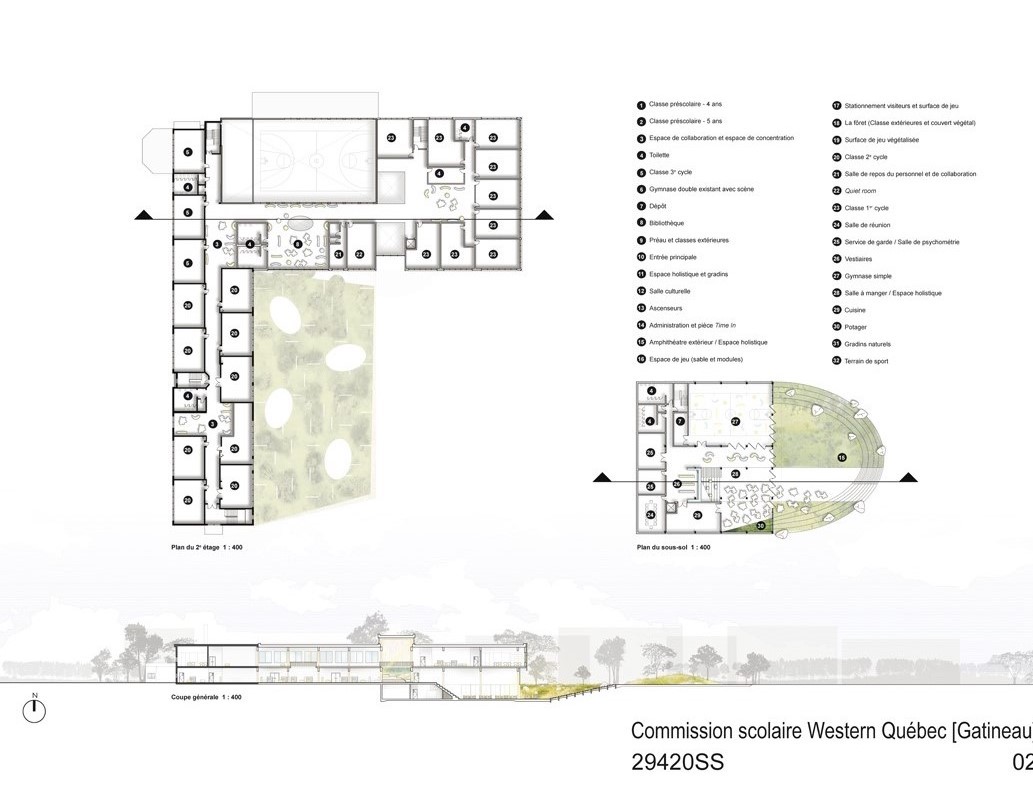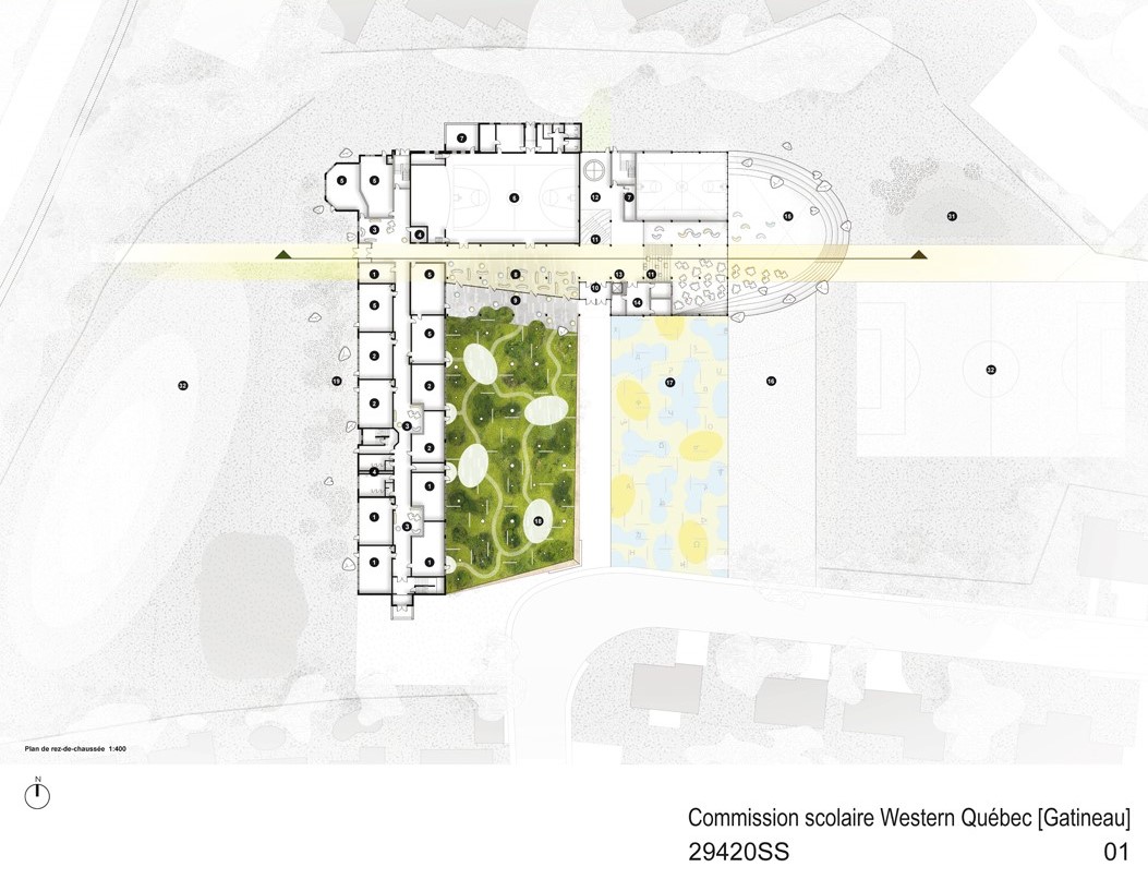 Un sentier est proposé comme parcours pédestre accessible à tous, reliant les aires de jeux extérieurs et traversant les différentes fonctions de l'école telle que l'espace holistique. Par la réorganisation et la démolition de la partie basse administrative qui entoure le gymnase existant, la création d'un 2e étage permet d'accommoder des espaces communs ouverts et ainsi de regrouper des classes de même cycle.
