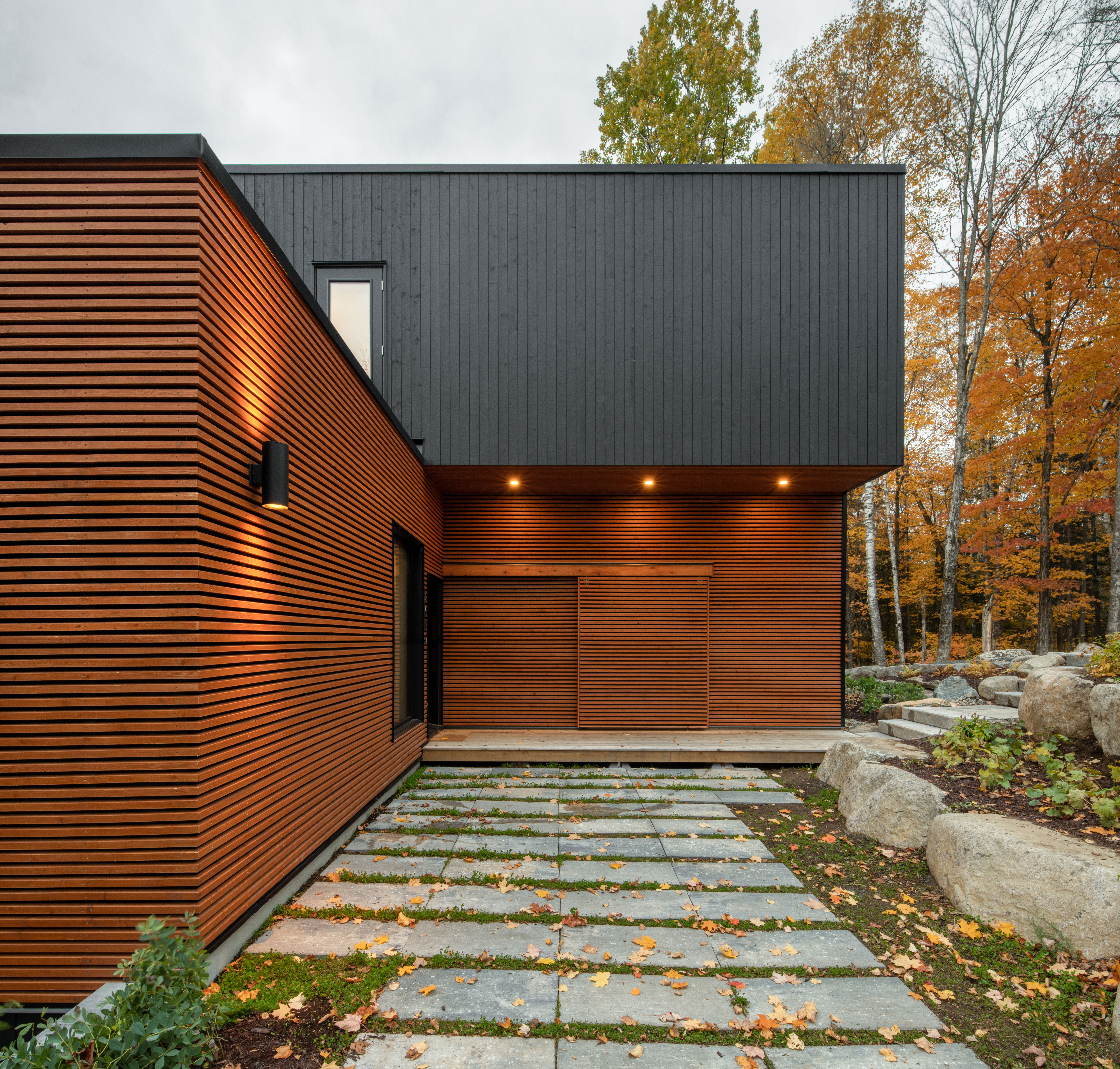 Le revêtement extérieur de couleur naturelle se fond dans le décor boisé et les accents noirs opaques ajoutent une touche artistique à la façade de la maison.