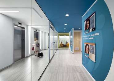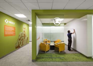 Ainsi, le nouvel environnement offre aux employés davantage d’espaces ouverts et lieux de détente, tant à l’intérieur qu’à l’extérieur de l’immeuble, permettant une utilisation efficace de l’espace. En outre, les employés de Merck partagent avec les autres occupants de nombreuses commodités, notamment un centre sportif, une cafétéria dotée d’une aire communautaire, ainsi qu’une cour extérieure paysagée.