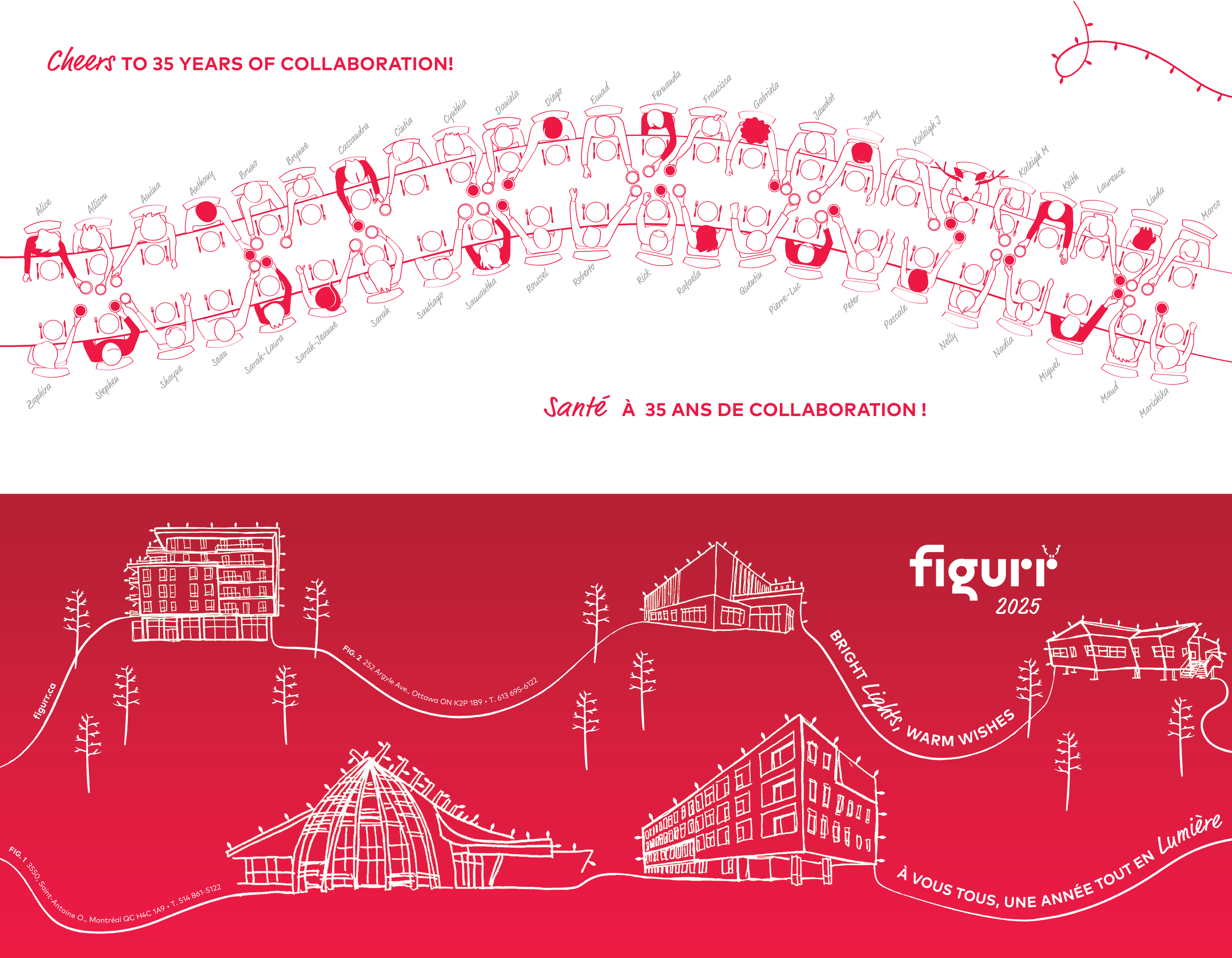Joyeuses fêtes de la part de toute l’équipe de Figurr ! Alors que nous célébrons notre 35e saison des fêtes, nous vous invitons à faire un voyage au cœur de nos souvenirs. Chaque année, les membres de notre équipe créent un design unique pour notre carte de vœux. En l’honneur de cette année anniversaire spéciale, nous avons décidé d’organiser un concours amical entre les membres de notre équipe pour cette édition festive.