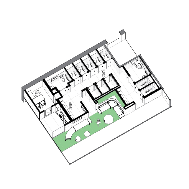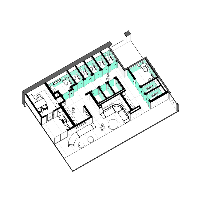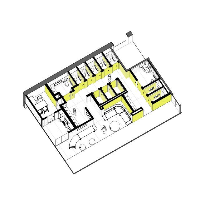 En raison de la demande croissante de « toilettes pour tous », l'équipe de Figurr a vu davantage de clients demander l'intégration ou la mise à jour des toilettes existantes pour des toilettes non genrées et accessibles. En général, la nouvelle configuration d'une toilette typique est divisée en trois zones – une série de cabines privées entièrement fermées dans des « stations communes pour faire sa toilette et se laver, et un salon qui transforme le couloir en un espace social animé ». Cette répartition de l'aménagement garantit la confidentialité et la sécurité des utilisateurs et facilite l'entretien continu. Cette configuration est essentielle pour créer un environnement plus inclusif et plus sûr pour tous.