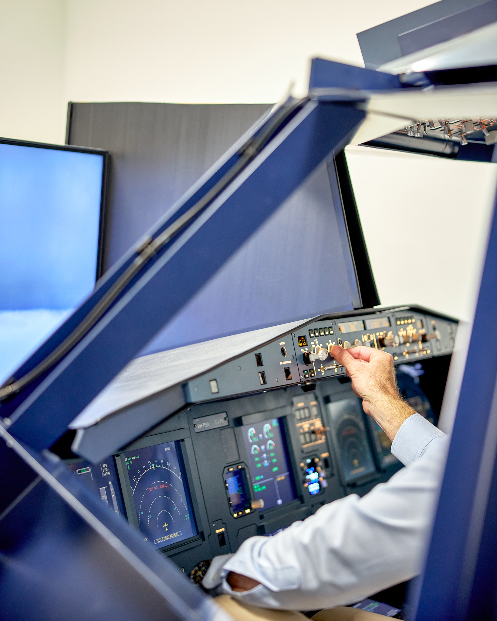Chaque étage possède une fonction précise : le rez-de-chaussée est dédié aux simulateurs gros porteurs et à l’équipement d’urgence, le premier étage comprend les simulateurs et les formateurs de procédures, alors que le deuxième niveau abrite les salles de classe et les bureaux administratifs. Cette organisation est à l’image des cabines d’avion : l’efficacité fonctionnelle et l’optimisation de l’espace s’y rencontrent.